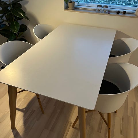 Sælger mit smukke spisebord fra Ilva. Bordet er originalt med træfarvet ben, men jeg har fået det lakeret sort hos et firma. Dog er den originale træfarve at se under bordpladen, kan ikke ses medmindre du kigger op under bordet. Bordet har et lille bitte hak i pladen, intet man ligger mærke til, det er ret svært at finde😅 det måler 160x90 og der medfølger 2 tillægsplader.