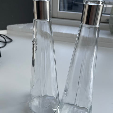 Rosendahl olie- og eddikeflasker fremstillet i klart glas med metalpropper. Designet til opbevaring og dosering af olie og eddike i køkkenet.