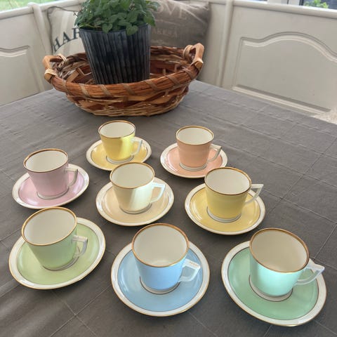3 hele sæt kop, underkop og kagetallerken + 1 sæt kop og underkop. Kagefad + sukkerskål. Ekstra kagetallerkener 8 stk