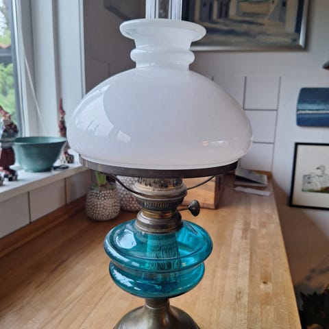 Fin gammel petroleumslampe med hvid opalglas skærm og messingdetaljer. Ideal Brenner 20. Den har hængt i sommerhus. Hænger fra loftet i et smedejernsophæng. Fungerer med hyggeligt, dekorativt lys.