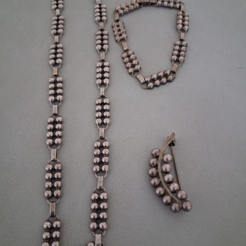Sælger dette meget flotte smykke sæt i sølv 925 s og blå emalje. Sættet er i rigtig fin stand uden ødelagte emalje hjerter. Kæden måler ca 40 cm. Brochen er 3 x3 cm