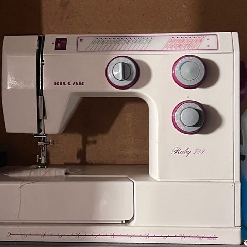 En ældre riccar symaskine. Kroggearet er knækket som kan ses på billede 14. Derfor skal det skiftes.