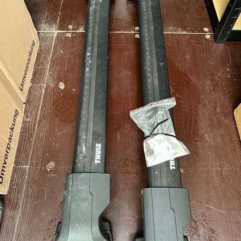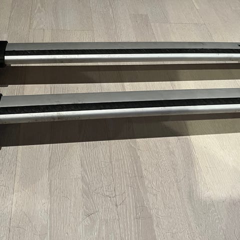 Thule tagbøjler til bil i aluminium med låsefunktion. Passer til forskellige bilmodeller og kan bruges til transport af bagage, cykler eller andet udstyr på bilens tag.