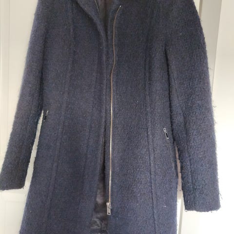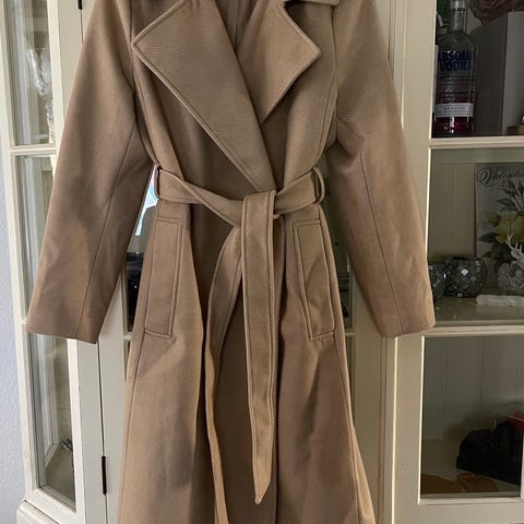 H&M frakke i beige farve lavet af uld, viskose og polyester. Frakken er designet til kvinder og har størrelse 36. Den har knaplukning og en klassisk krave.