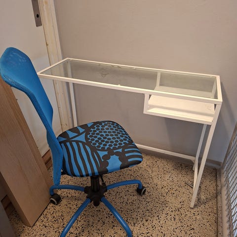 Glasplade med en enkelt hylde til opbevaring. Slankt stålstel.