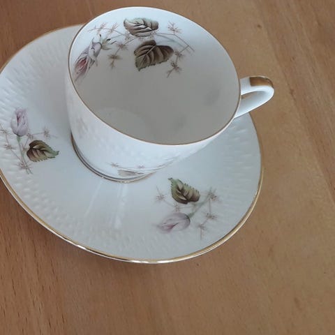 Edelstein kaffekop med underkop i porcelæn. Koppen har et mønster med blomster og dekorative detaljer i guld. 10 kopper med underkopper sælges helst samlet
