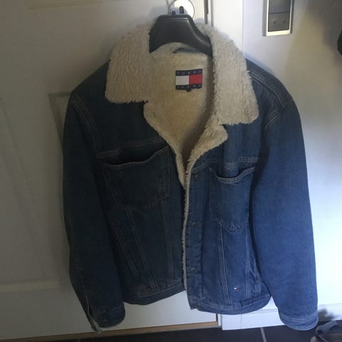 Tommy Hilfiger vinterjakke til herre i størrelse M. Jakken er blå og lavet med dun som materiale, hvilket giver isolering og varme. Designet til udendørs brug i kolde perioder.