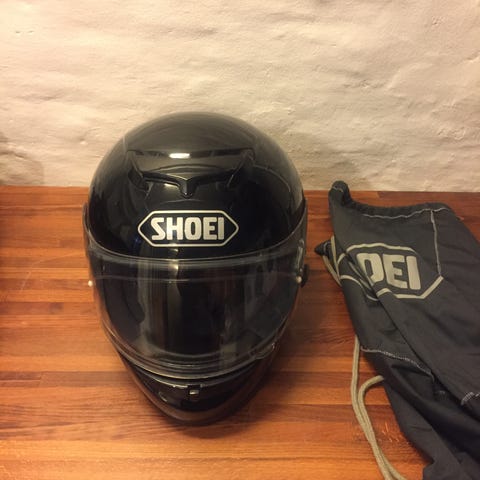 Shoei motorcykelhjelm i rød farve. Hjelmen er med klart visir. Ridse i den ene side. Str xs.