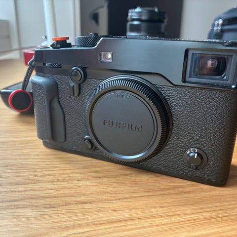 Fujifilm X PRO 1. En af de eneste kamera med den legendarisk X-Trans CMOS I sensor. kameraet har et par kosmetiske skrammer men ikke noget der går du over noget funktionelt. Kameraet kan købes med en 23mm f2 fujifilm linse det svare til 35 på full frame. Der medfølger batteri, lader og original boks. se mere her: https://www.youtube.com/watch?v=NT0Xsntv-XI
