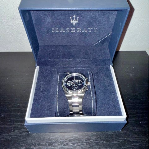 Maserati herre ur med stålrem og blå urskive. Uret leveres med ekstra led til remmen og opbevaringsæske. Designet til mænd.