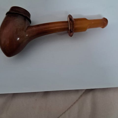Antik Pibe med langt skaft, lavet af træ og metal, med låg på skålen. Farven på skaftet er sort, og skålen har en brun nuance. Piben har en buet form og er designet til rygning.