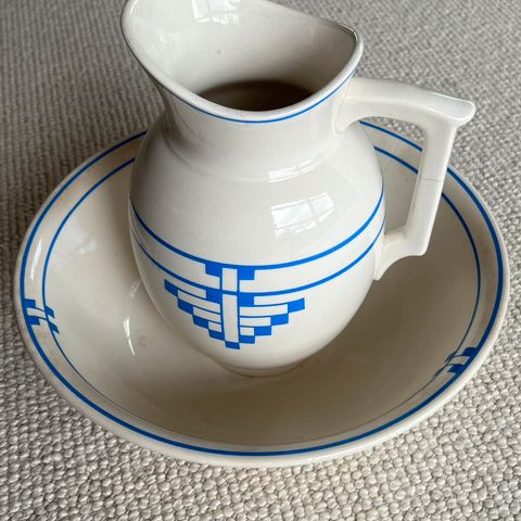 Sættet består af en kande med hank og et stort fad, samt en sæbeskål med låg.