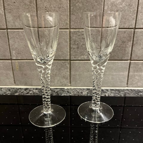 Jeg har fire stk af de helt små snapseglas. 11,5 cm i højden og rummer højst 2 cl. Så det er vel det man kalder en dram. De er rigtig fine, ingen skår eller glaspest. Prisen er pr stk 40 kr. Du kan få alle fire for 125 kr.