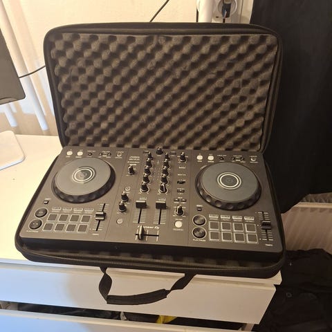 Pioneer DDJ-SR2 DJ controller med to joghjul, flere knapper og drejeknapper til mix og kontrol. Enheden har en sort finish og er designet til DJ-brug.