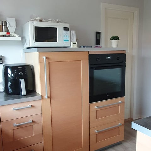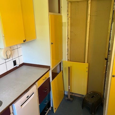 Diverse moduler/låger sat sammen til et skab, formentligt fra et gammelt køkken. Fin overflade i lakeret træfiner. Kan benyttes til diverse hobby- eller renoveringsprojekter.
