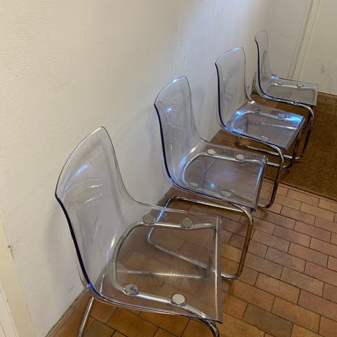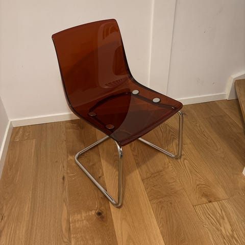 I’m selling an IKEA TOBIAS chair with a transparent seat and a chrome-plated frame. It’s a stylish and comfortable chair that works well as a dining chair, an extra guest chair, or at a modern desk.