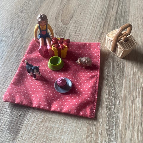 En flot schleich camper med massere af udstyr og figurer. Der er ting som fx. Et spring, 3 store heste, et føl, en meneske figur, indhegning, bord og stol. I meget god stand.