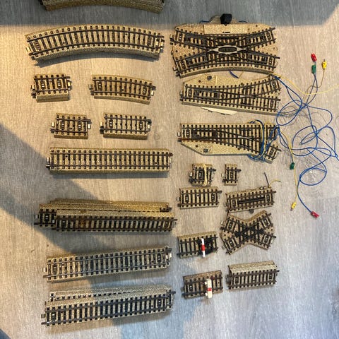 Sæt med modeltog skinner og tilbehør i forskellige former og størrelser. Indeholder lige og buede skinner samt elektriske komponenter til modeltogbaner. Materialer inkluderer træ og metal. Egnet til hobbybrug og modeltogsopbygning.