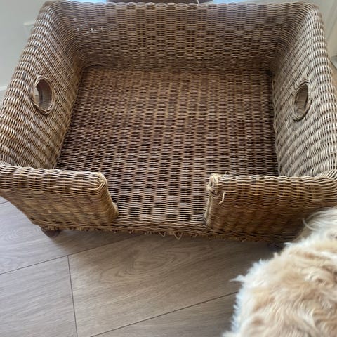 Fletkurv til kæledyr lavet af naturfarvet rattan. Kurven har en rektangulær form med høje sider.