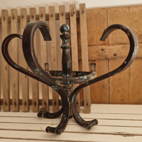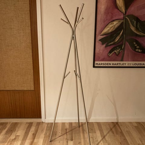 Stativet har overfladisk patina som ses på billederne, men er stadig både praktisk og enormt dekorativt 🤩 Hæng dit tøj her i stedet for at smide det i en bunke på stolen eller gulvet 🤗 Mål 88x24 cm. Pris 250 kr.