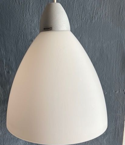 Sort glas pendel lampe med rund form og kabel til ophængning. Lampen har en blank sort finish udvendigt og en lys grå indvendig overflade. Passer til almindelig pære med skruesokkel. Velegnet til brug som loftlampe i forskellige rum.