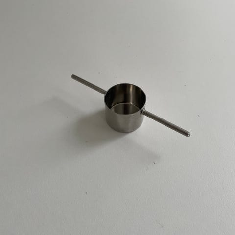 En drikkedunk fra Stelton i metal. Helt ren og fin indvendigt, i ubrugt stand. 21 cm høj. Låget er guldfarvet, man skruer det helt af.