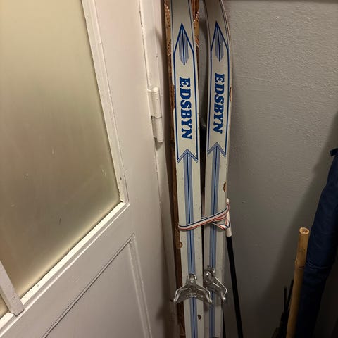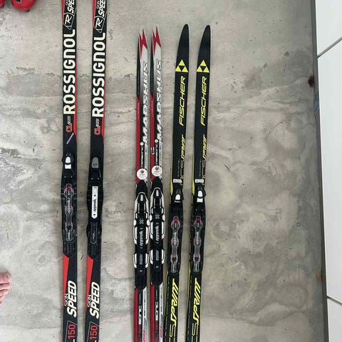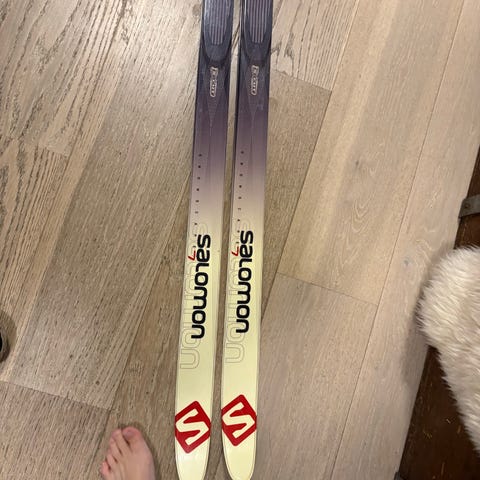 Salomon Equipe 4.5 langrendsski i hvid, gul og blå farve. Længde 156 cm. Fine og velholdte.