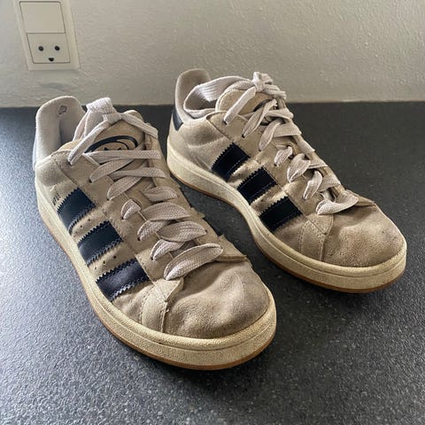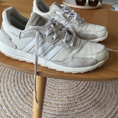 Hvide Adidas-sneakers i tekstil. Skoene er str. 41 1/3, men efter min mening lidt små i størrelsen. De er brugt en del og har synlige brugsspor, men fremstår i fin stand. De trænger til at blive vasket.