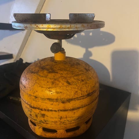 Primus gasbrænder med lidt gas i gasbeholder. Gasbrænderen er designet til udendørs brug og fungerer med en standard gasbeholder. Produktet er velegnet til madlavning på tur eller camping.