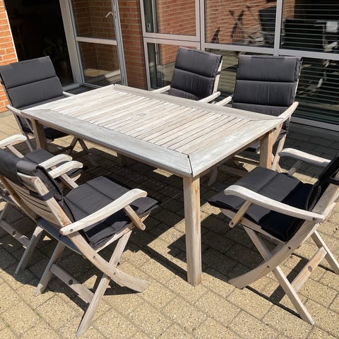Avernakø havebord og stabelstole plus tilhørende hynder sælges pga flytning.