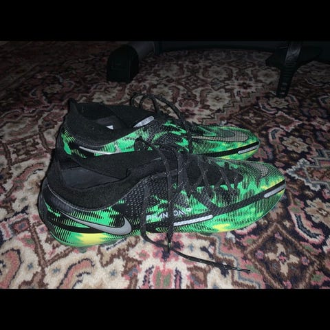 Nike fodboldstøvler i størrelse 41 med hvid overdel og orange knopper til græsunderlag/kunstgræs. Inkluderer sorte og hvide Nike fodboldsokker samt Nike Mercurial Lite benskinner med sort og grøn farve, str. M