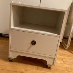 Natborde med to skuffer. Natbordet er hvidt med ben af træ og har et enkelt design.