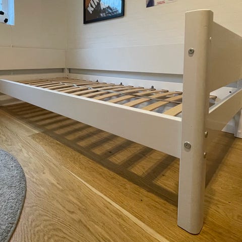 Flexa enkeltseng til børn med hvid ramme og naturlige træben. Sengen har lamelbund og inkluderer en aftagelig sikkerhedsskinne. Designet til børneværelser med fokus på funktionalitet og enkelhed.