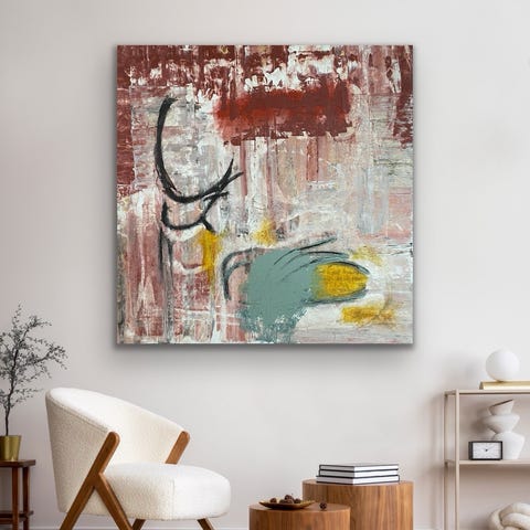 Abstrakt maleri med figurative elementer, domineret af røde og blå farver. Maleriet har en dynamisk komposition med tekstur og kontrast mellem farverne.