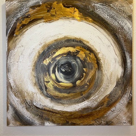 Abstrakt maleri med tekstur i guld og hvid farve. Maleriet har et nonfigurativt motiv med blandede metallic og neutrale toner. Velegnet til dekoration i hjem eller kontor.ramme kan købes