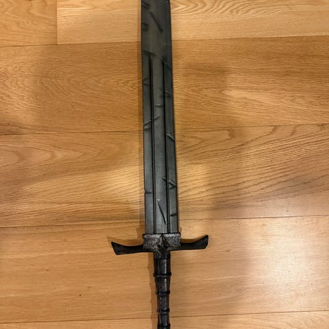 Kort sværd med klinge i skum og brun læderindpakning på håndtaget.