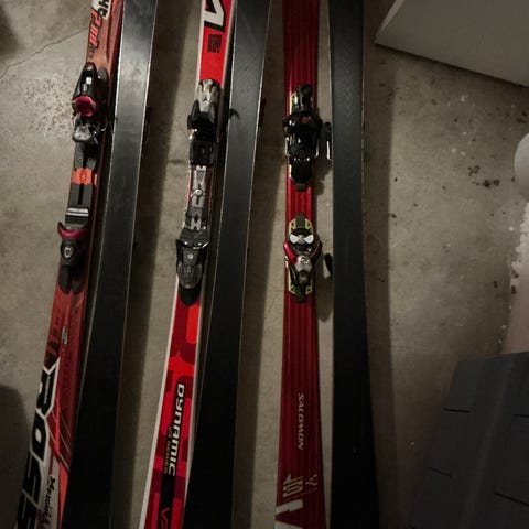 Salomon carvingski l:174 med atomic bindinger nyslebet og vokset 2025, skiene er autentiske storslalom race ski fra 2007, og efter lidt tilvænning de fedeste ski jeg har haft, super stabile når man kommer op i fart og så synes jeg det er sjovt at de ser så retro ud. Der mangler lidt af plastikken på snuden af den ene ski men det er uden betydning for funktionalitet.