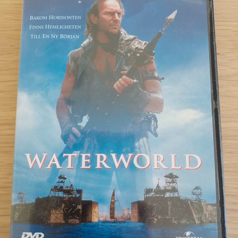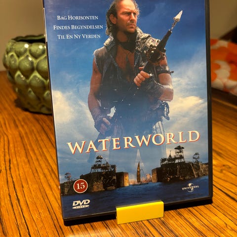 Waterworld DVD film med Kevin Costner. Filmen er en science fiction-genre, hvor handlingen foregår i en fremtidig verden dækket af vand. DVD-formatet gør det muligt at afspille filmen på kompatible enheder.