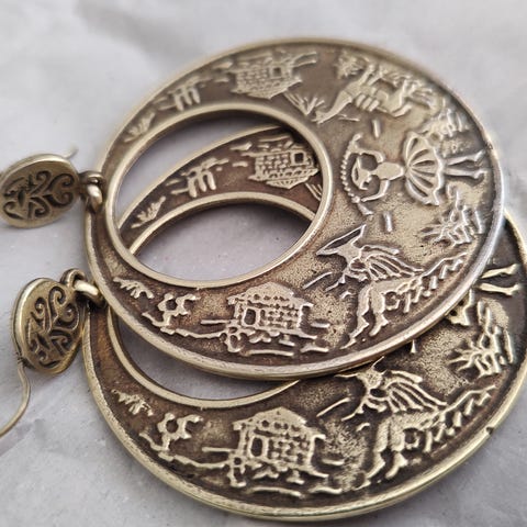 Øreringene er aldrig brugte og har ligget i smykkeskrin - har en anelse patina. Nypudsede og fine.