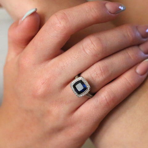 Meget smuk ring i 18 karat hvidguld med blå safir (ca. 3x5 mm) og diamanter (0,20 CT) rundt om. Str. 52. Købt i Dubai i 2021 og brugt meget lidt.