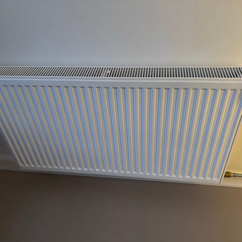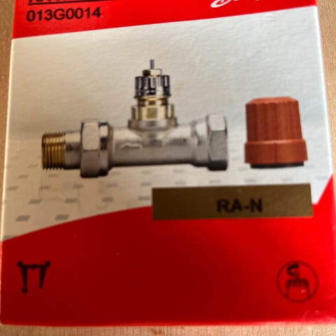 Danfoss radiator med termostatventil, hvid, egnet til opvarmning af mindre rum som badeværelse. Radiatoren er monteret med en hvid termostatventil til regulering af varmeindstilling.
