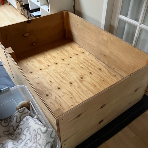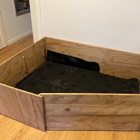 Stor fødekasse. Kan bruges til hvalpe eller killinger. Der medfølger pinde så mor ikke ligger sig på hvalpene, og brædder der kan lukke eller åbne for udgang, og sikre hvalpene bliver i kassen.