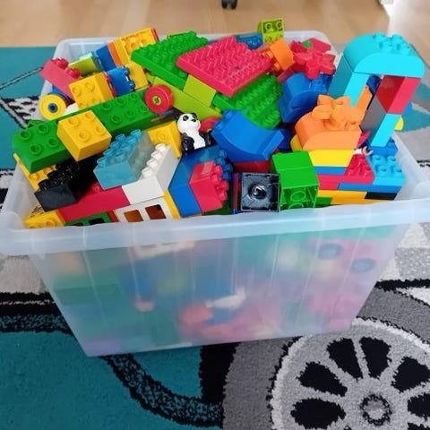 En masse blandet legetøj til børn indeholder forskellige typer legetøj i flere farver og materialer. Sættet inkluderer blandt andet bilbane, Paw Patrol stationstårn og diverse løsdele, legetøjsbiler, stablelegetøj, og diverse aktivitetslegetøj. Velegnet til leg og udvikling af motoriske færdigheder for børn i alderen 1-5 år.