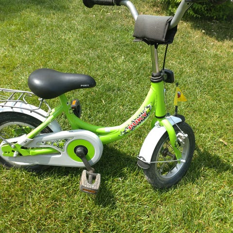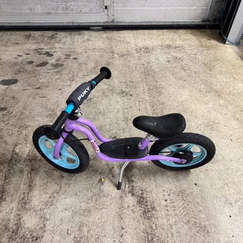 Pink puky med 12" hjul. Støttehjul og brugsanvisning medfølger. Lidt maling er slidt af bagagebæreren.