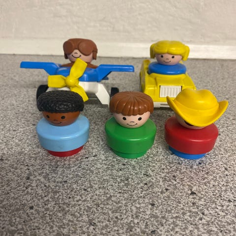 Fisher-Price Lift & Load Depot med tilbehør som figurer, lastbiler og byggeudstyr.
