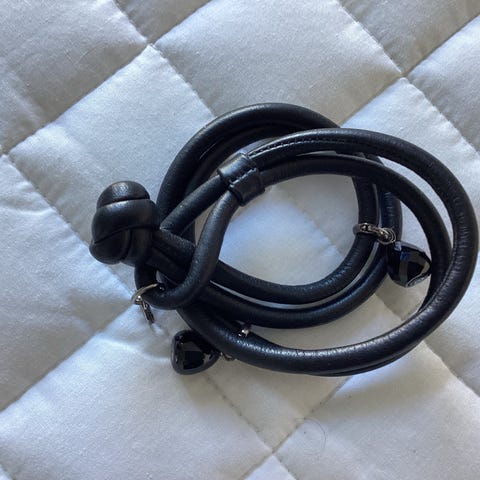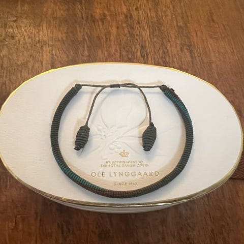Life armbånd, i 18 karat guld med snor i rød og beige. Måler ialt 17 cm. Det er brugt men ikke slidt. Den beige del er en anelse mørkere i farven end da det var nyt. Ny-prisen er 6200 kr.