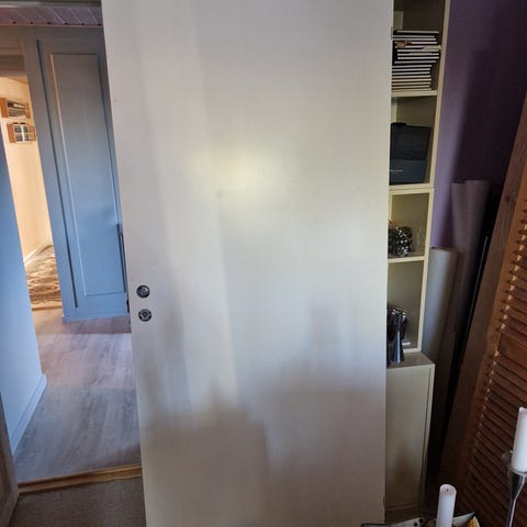 Hvid dør med tilhørende håndtag. Døren er enkel i design og egnet til indendørs brug.72x204 - 4 cm tykkelse. Giv bud