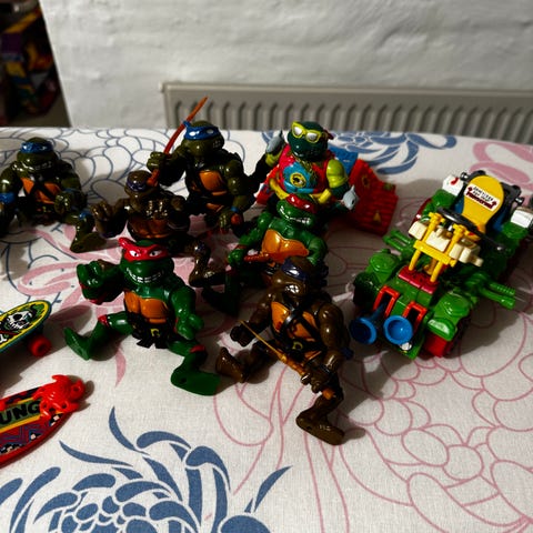 Figurer fra Teenage Mutant Ninja Turtles universet, plus et par tegneserier og lidt tilbehør. . Alt er fra 80 og 90erne.