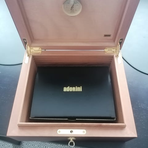Humidor/ cigarskab i cedertræ med hygrometer og glaslåge incl. brugsanvisning m.m. Har fire skuffer af træ.