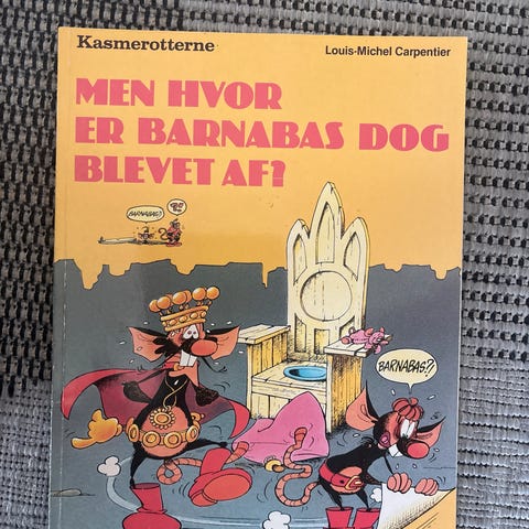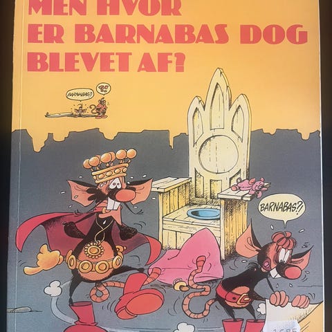 tegneserie med titlen 'Men hvor er Barnabas dog blevet af?'. Bogen indeholder illustrationer og tekst på dansk.